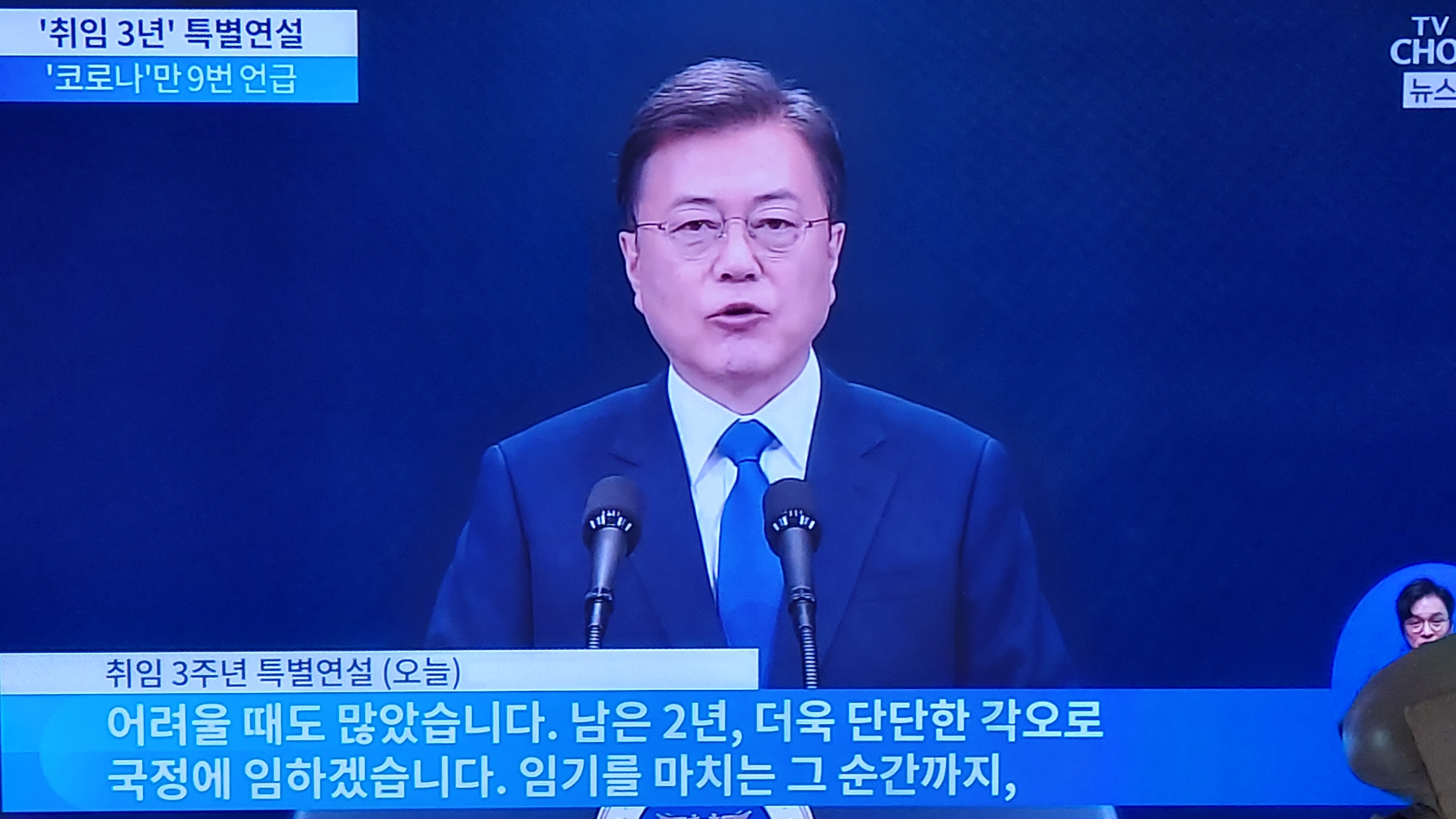 Q. 문재인 3주년 연설 22분간 진행. 원고도 보지 않고 앞만 보고 단한번의 실수도 없이 하는거 보니 머리는 좋음.