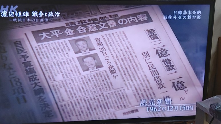 이때 요미우리신문에는, 일본 측이 한국에 무상 3억 달러, 차관 2억 달러, 민간차관 1억 달러를 제공하기로 했다는 대특종이 1962년 12월 15일자로 실렸습니다. 와타나베는 한일국교정상화 교섭의 합의내용을 JP로부터 듣고 그 때 특종을 쓸 수 있었다고 고백하고 있습니다.