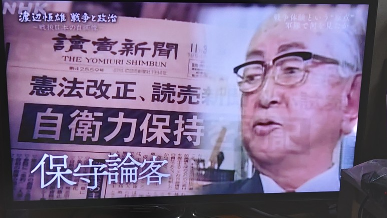 8월 9일 밤 9시에 방영된 NHK 스페셜에서는, 요미우리 신문(読売新聞) 그룹 본사 대표이사 겸 논설주필인 와타나베 쓰네오(渡辺恒雄) 씨(94세)를 롱 인터뷰한 다큐멘터리 프로 『와타나베 쓰네오 전쟁과 정치 - 전후 일본의 자화상』이 방송되었습니다.