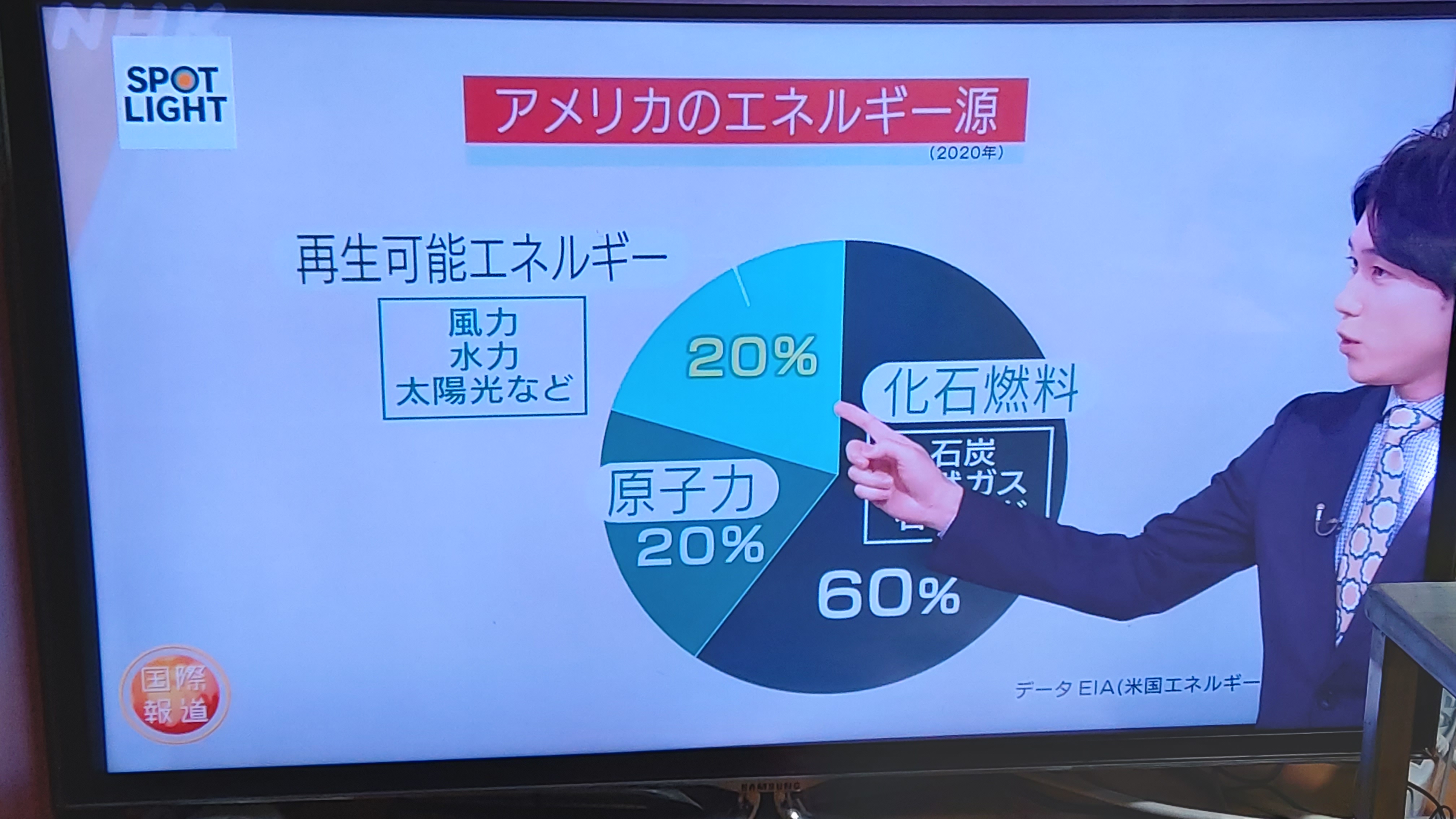 ↑ 화석연료(化石燃料)가 60%, 재생가능 에네르기(再生可能エネルギー)가 20%, 원자력(原子力)이 20%를 차지하고 있는 미국의 에너지원(源)