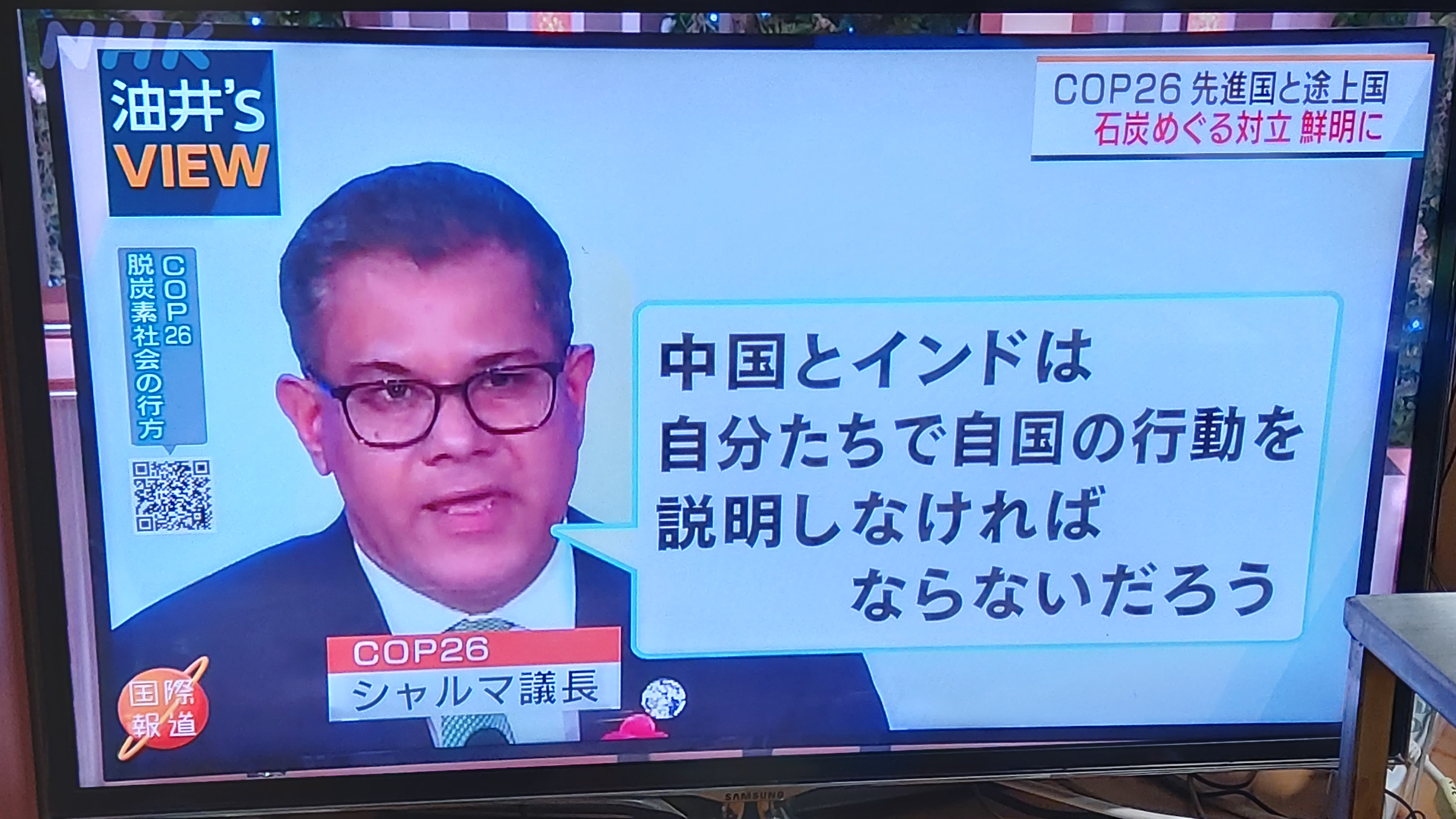 ↑ 중국(中国)과 인도(インド)를 눈물로 비판하고 있는 COP26 샤르마 의장