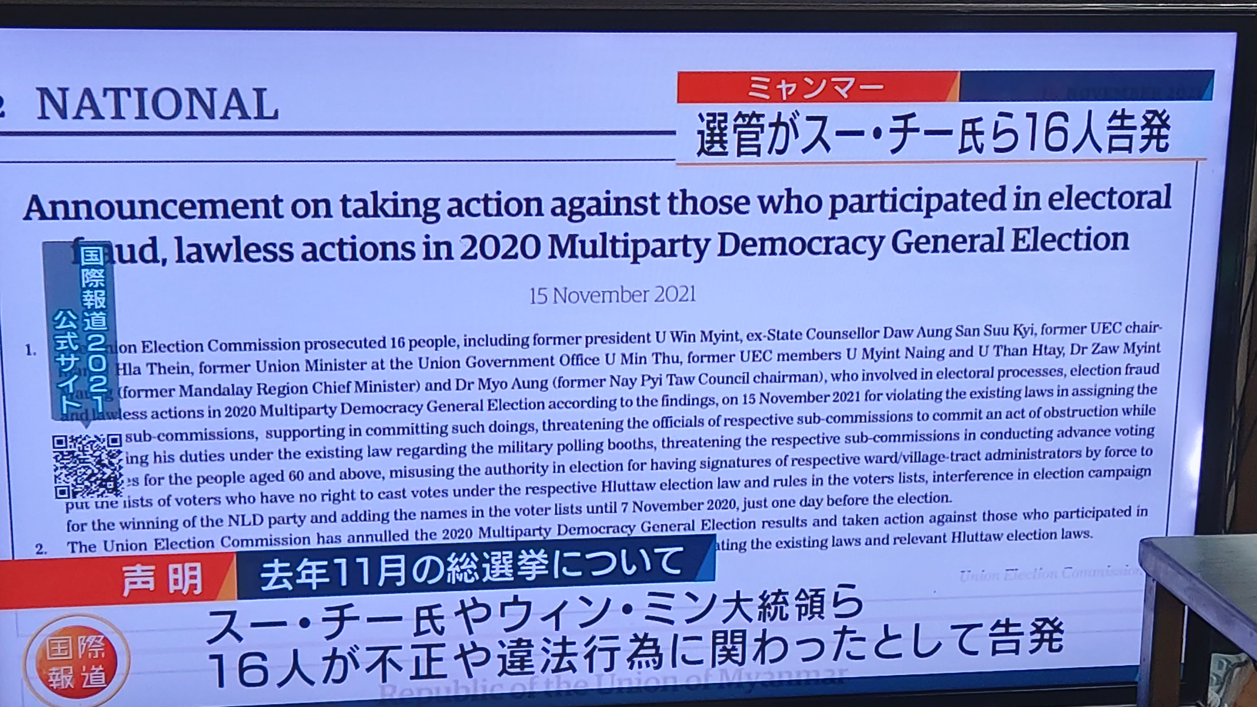 아웅산 수치 등 16명 부정선거와 위법행위(2020.11 총선거)로 고발당해