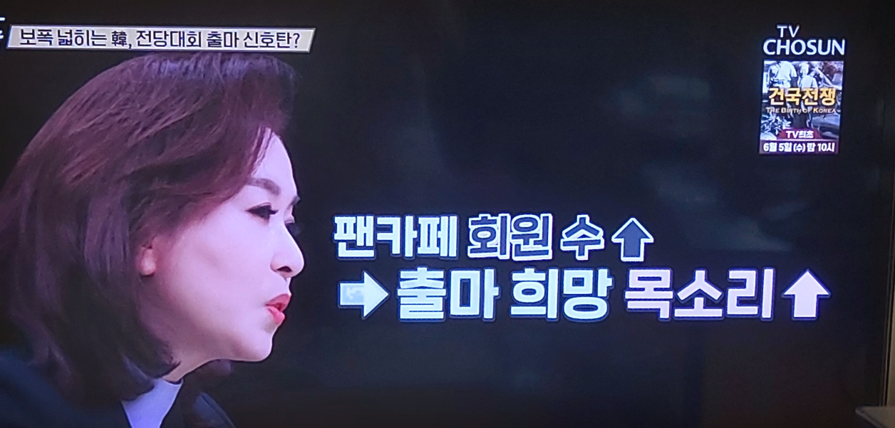 그러나 그런다고 한동훈의 기가 꺾이겠습니까? 지금 한동훈 팬카페의 회원수는 증가하고 있고, 당대표선(選) 출마를 부추기는 목소리도 높아지고 있습니다.