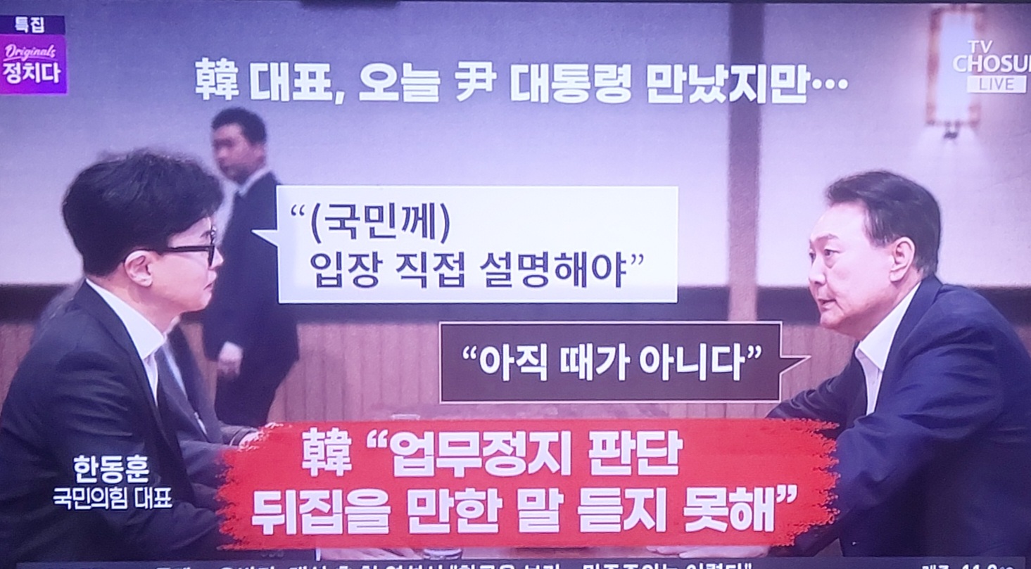 ↑ 12월 6일(金) 오전 한동훈이 윤석열의 직무정지를 주장하자, 화들짝 놀란 尹이 이날 오후 대통령부(府)로 韓을 불렀다. 韓은 국민들에게 직접 입장을 밝히라고 尹을 다그쳤지만, 尹은 때가 아니라고 하면서 '고토왔타(断った : 거절했다)'.
