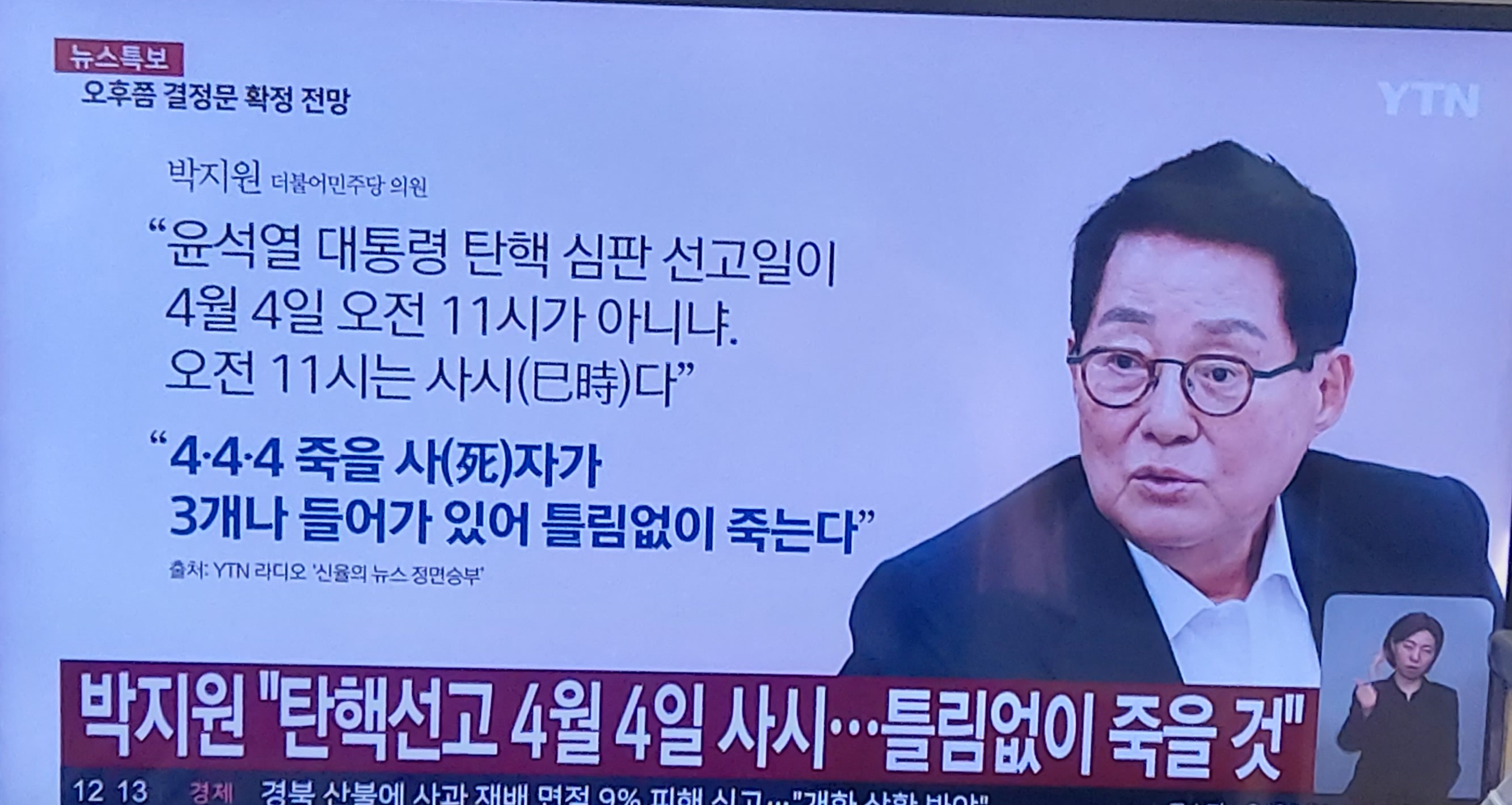 "윤석열은 선고일이 4월 4일 11시(巳時)인지라 '사'자(字)가 세개나 들어가 있어 틀림없이 죽는다"고, '노로이(呪い : 저주)'를 퍼부었습니다.